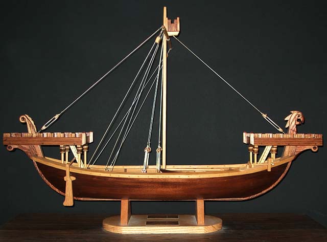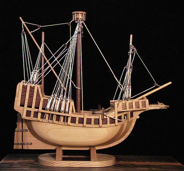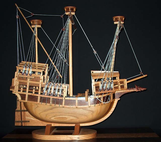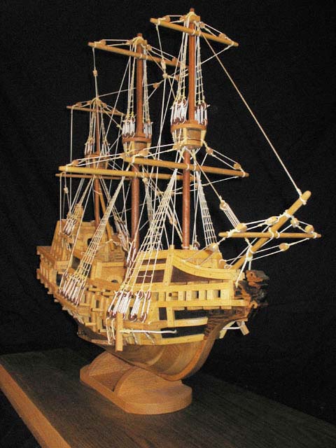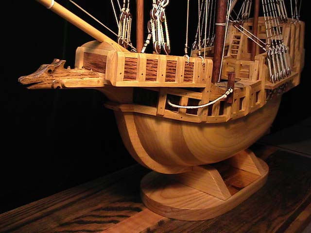 (208) 340-9371 Medallion Series | Fantasy Series | Majestic SeriesFantasy Ship CarvingsUntil 2004, only eight Fantasy Series ships existed, and were in the ownership of family and friends. John chose to begin selling ship art to the public in 2005: all the first publically available ships being of the Medallion Series. It was anticipated that only one or two Fantasy Series models would be made per year for public sale, yet no new construction was started until late 2009. All Fantasy Series ships are carved from blocks of hardwood that are glued, screwed, nailed, and/or pegged together for centuries of structural stability. Earlier Fantasy Series ships have nylon and individualy hand crafted wooden pullies, etc. Fantasy Series ships have historically measured about 26 inches to 34 inches long; by 14 inches to 30 inches tall; by 10 inches to 12 inches wide. Each completed ship comes with two brass title plates that note the type of ship represented, the date (year) the model was made, and the name of the artist. The underside of each ship's display base and the bottom of its display case (if present) are signed, numbered and dated.