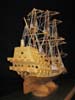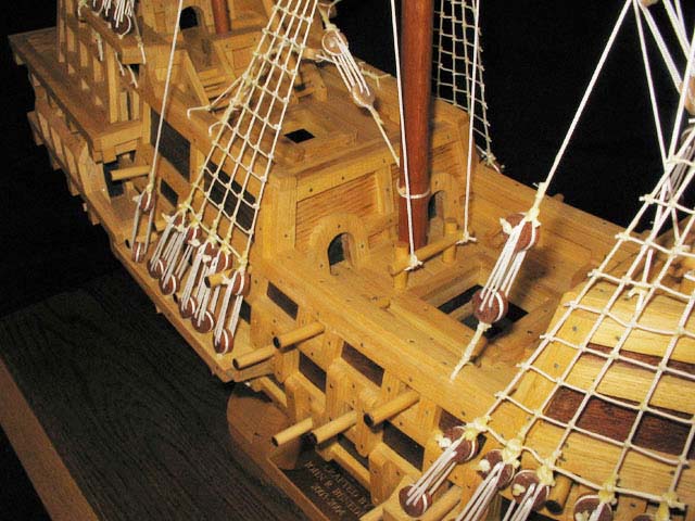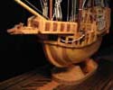 New Generation of Fantasy Ship CarvingsIn 2009, John began to design Fantasy Series ships utilizing all brass rigging and copper sails as now used on all Medallion Series ships since 2008. The first of the new generation of Fantasy Series ships is a Late 18th Century Sloop-of-War completed in April of 2010. This ship measures about 43 inches long, by 40 inches tall and 10 inches wide. It is made from poplar, oak, ash, black walnut, blood wood, and South American rose woods. For the first time, cannon barrels were individually hand crafted from brass tubing. This newer ship design is shown below.