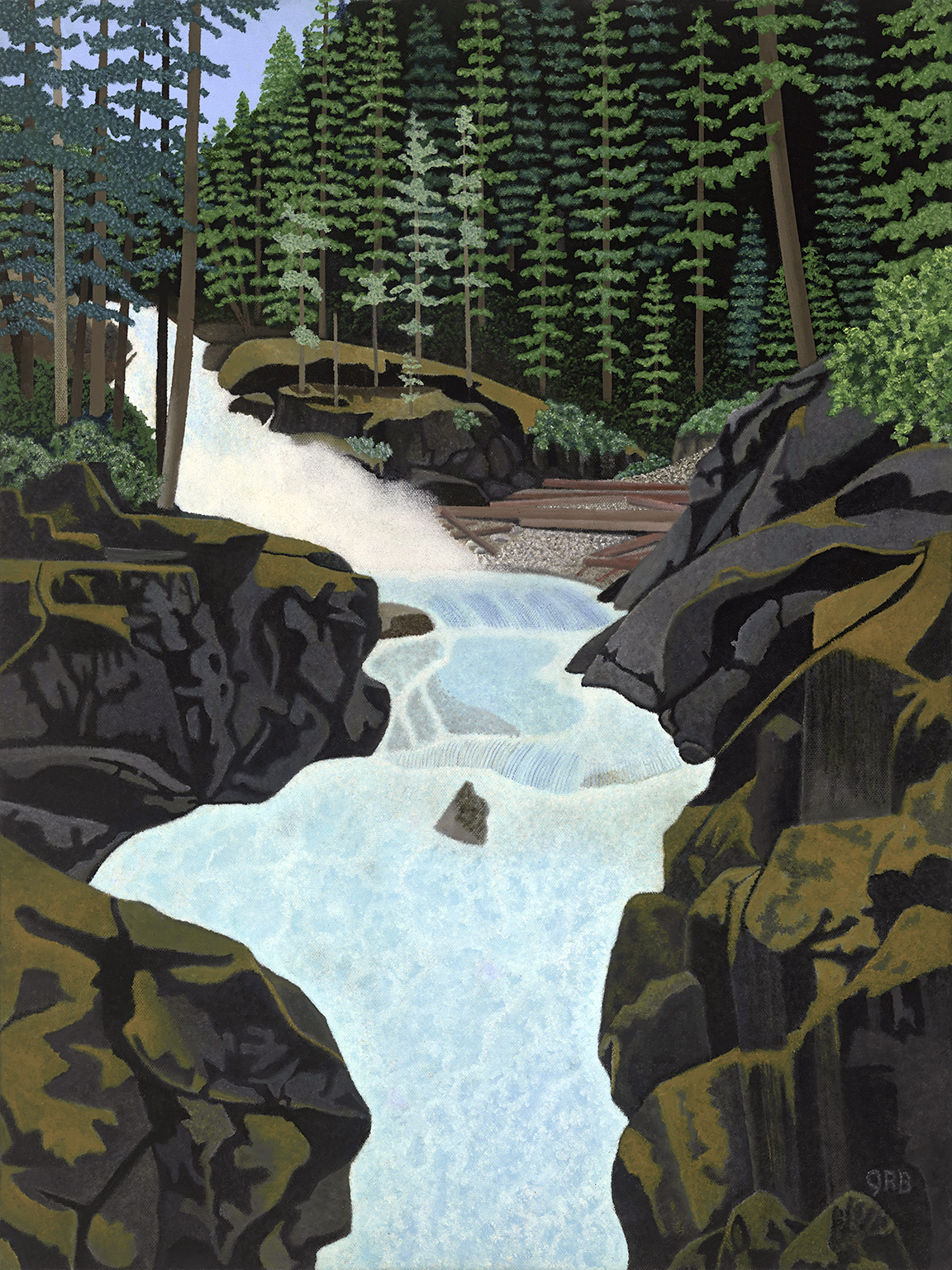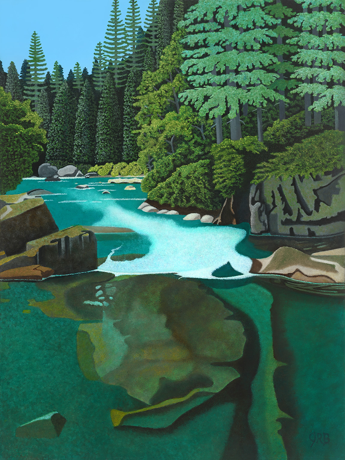 John began experimenting with alkyd oil paints in 2008. So far, John has completed over 75 paintings. Digital scans of a limited number of these paintings are shown on this website. John's landscape paintings emphasize line, form and color the way graphic poster art often does. Texture in his paintings is not achieved by the "piling on" of paint but rather by the blending of multiple colors using a dot/point technique: most often when imaging trees and shubs, and moving water. In most of John's work you will see thousands of bots used to depict natural features: in larger paintings there are tens-of-thousands of painted bots. By not over utilizing physical texturing, John's original oil paintings best serve photographic reproductions on canvas. Overall, John attempts to capture the "essence" of natural landscapes with sharp/crisp lines and brilliant colors. As such, he calls his work "graphic oils". Some have come to call John's painting technique as "super realism."